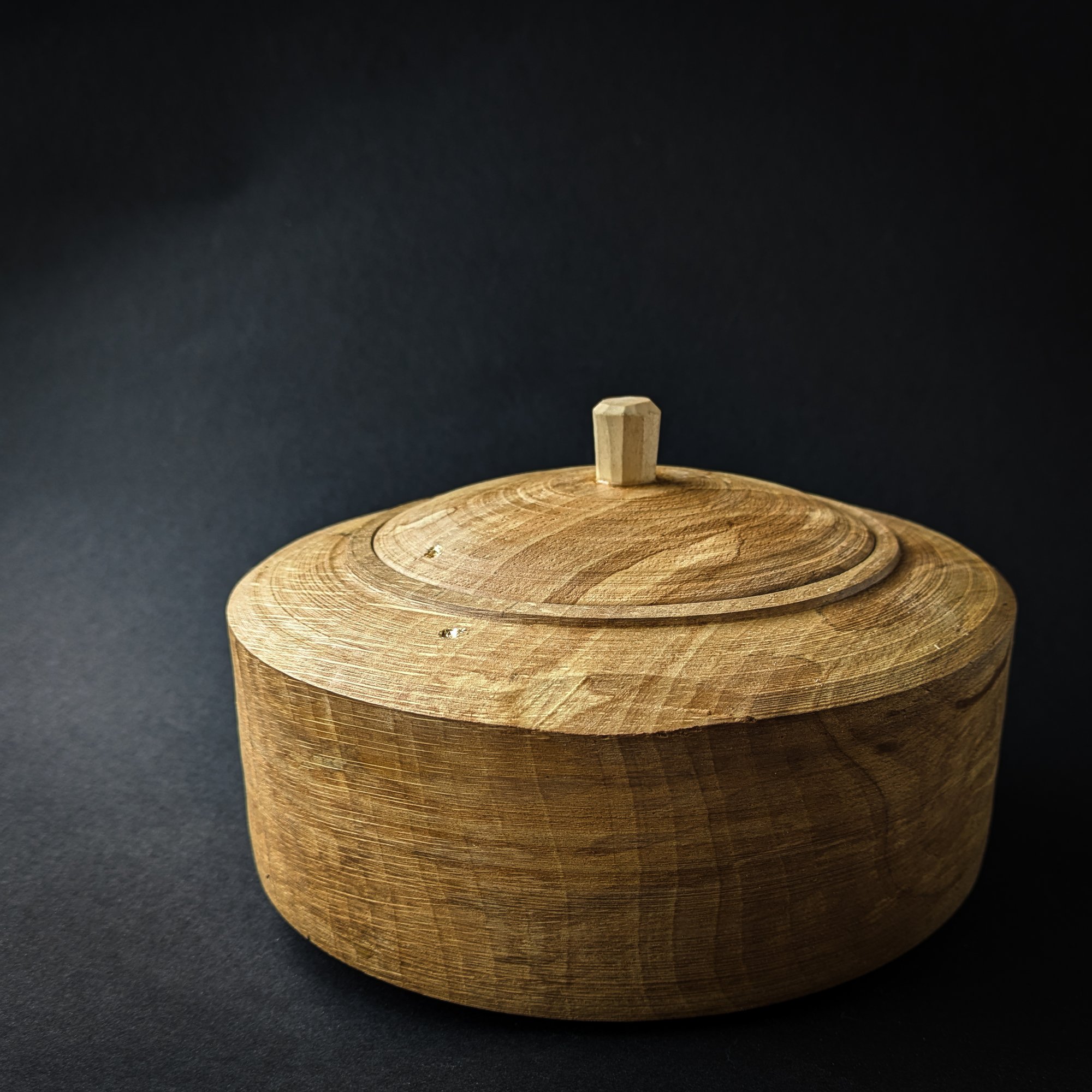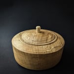 Locking lidded box turned on pole lathe with a hand carved handle. These boxes are based on beautiful old Swedish boxes. They are quite technical bits of turning, requiring a lot of precision. There are only a handful of turners in the world who have the skill to turn these mechanisms.