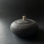 Locking lidded box turned on pole lathe with a hand carved handle. These boxes are based on beautiful old Swedish boxes with decoration inspired by Neolithic stone carving.