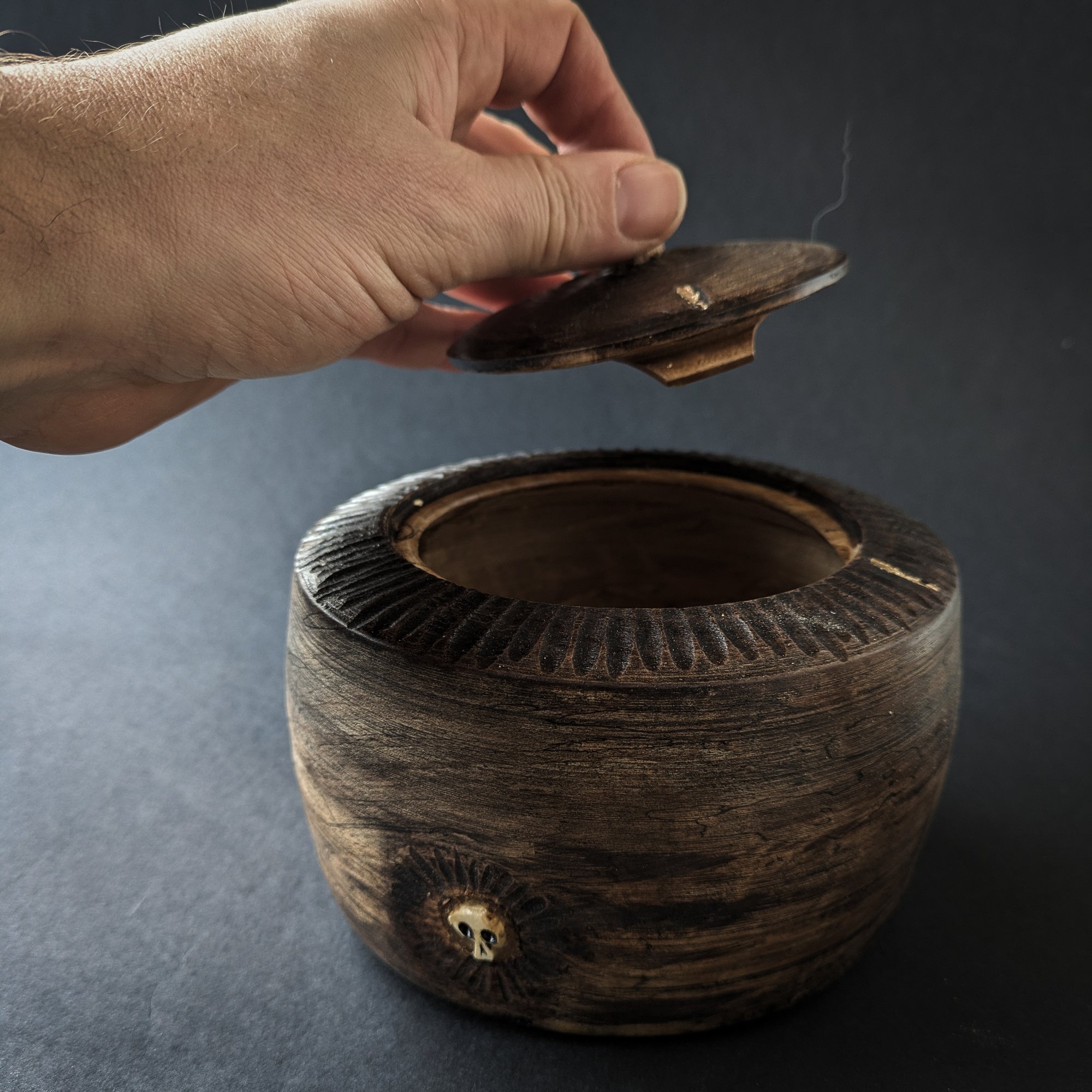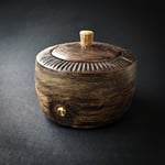 Locking lidded box turned on pole lathe with a hand carved handle. These boxes are based on beautiful old Swedish boxes. They are quite technical bits of turning, requiring a lot of precision. There are only a handful of turners in the world who have the skill to turn these mechanisms.